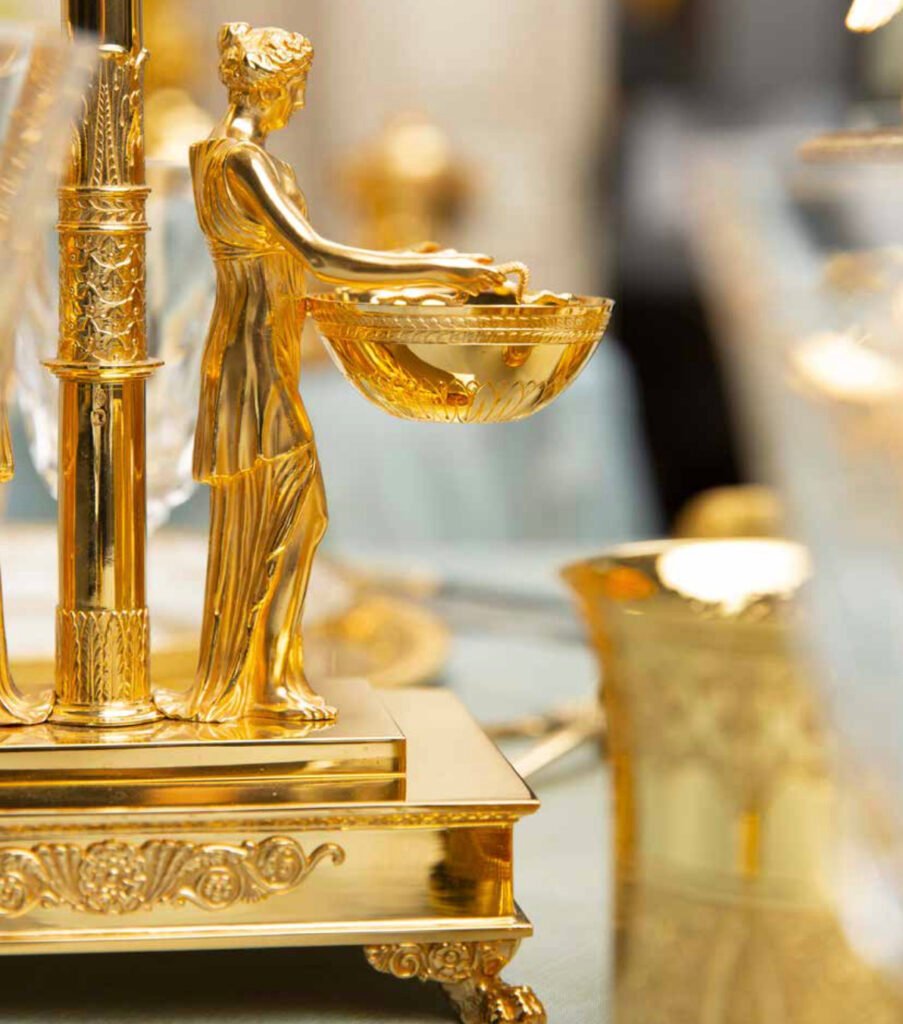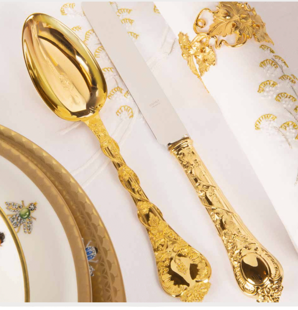 Enfin, lorsque qu’une finition vermeil est choisie, une pellicule d’or 24 carats est alors appliquée sur le couvert en argent massif.